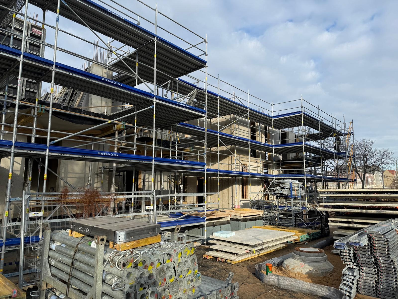 Auf der Baustelle der FröbelHöfe in Dresden ist der Fortschritt klar erkennbar. Der Rohbau entwickelt sich planmäßig, aktuell entstehen die ersten oberirdischen Geschosse und die tragenden Strukturen prägen zunehmend das künftige Gesamtbild.