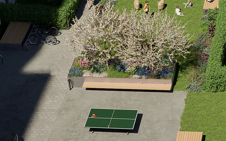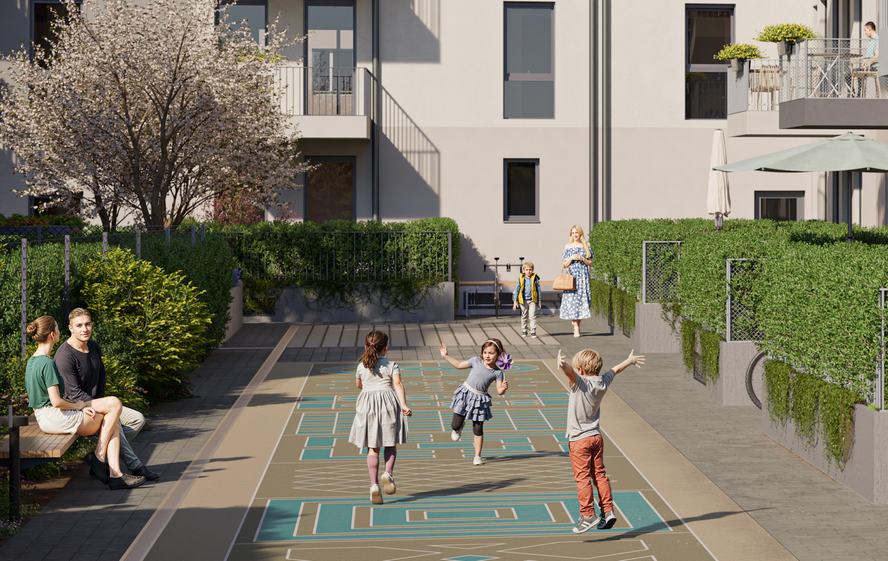 Auch bei den FröbelHöfen spiegelt sich dieser Gedanke wider: Ein ruhiger, geschützter Innenhof bildet das grüne Herz des Quartiers. Autos werden bewusst in die Tiefgarage verlagert, sodass oberirdisch Raum für Begegnung, Bewegung und Erholung entsteht. Geplant sind kleine grüne Inseln, naturnahe Spielelemente wie Holztiere, Schaukeln und eine Trampolinfläche sowie Wege mit kreativen Bodenspielen. Der Innenhof ist von allen Häusern aus zugänglich und schafft einen sicheren Rahmen für gemeinsames Spielen und nachbarschaftliches Miteinander.